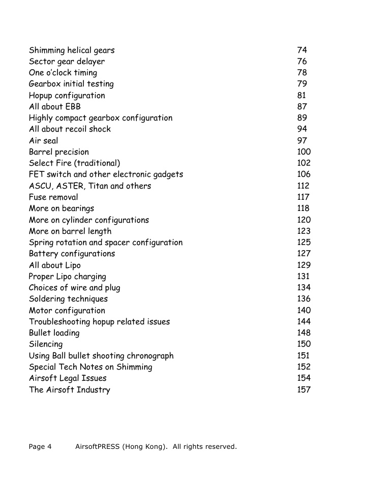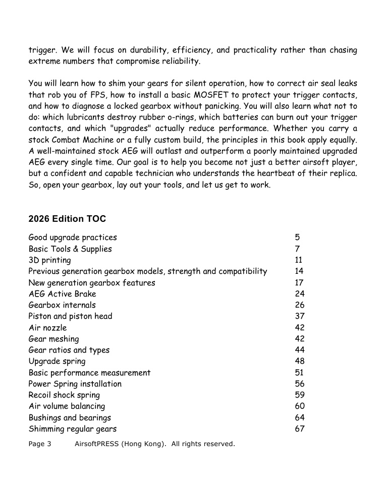 This book is organized for both the beginner who has never opened a gearbox and the experienced tech who wants to fine-tune advanced setups. Early chapters cover essential maintenance: cleaning your barrel, checking your hop-up bucking, lubricating your gearbox at proper intervals, and diagnosing common problems like misfeeding, double-feeding, and inconsistent velocity. Later chapters dive into upgrades, including selecting the right motor for your desired rate of fire, choosing a spring that balances power with gearbox longevity, and installing MOSFETs or electronic trigger units for improved trigger response and battery safety…etc.